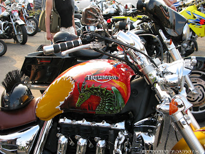 而停在外頭最顯眼的,莫過於這台重機了。誇張的外表,加上鮮艷的色彩,整個就像是在告訴你:「來看我!」的意思。感覺就像是在電影裡才能看到的車子一樣,許多人都拿著相機喀擦喀擦的在拍,我當然也拿著心愛的G9來拍了好幾張特寫,重車果然是男人的夢想,把妹的利器啊!(誤)